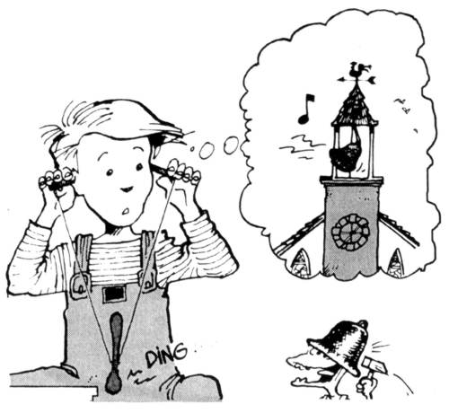 Rúčku lyžičky priviažte do stredu motúza. Konce motúza oviňte okolo drievok, priložte si ich k ušiam a lyžičku buchnite o stôl. Obe šnúry musia byť dobre zapnuté. Začujete zvuk podobný zvoneniu zvonov. Bez motúza a drievok budete počuť iný zvuk.