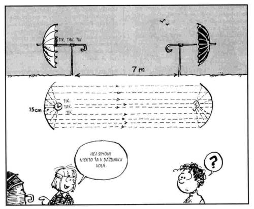 Dve palice zapichnite do zeme tak, aby medzi nimi bola vzdialenosť 7 metrov. Lepiacou páskou prilepte na palice rúčky dáždnikov (vnútra dáždnikov sú oproti sebe). Na rúčku jedného dáždnika pripevnite asi 15 cm od stredu budík. Rýchlo ežte k druhému dáždniku a priložte si ucho asi 15 cm od dna dáždnika a spozorujete slabé tikanie budíka. Ale ak sa premiestnite nebudete nič počuť.