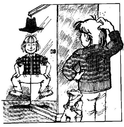 Odtiahnite skriňu do vzdialenosti 30 cm od múru. Nasaďte si klobúk a postavte sa za skriňu tak, aby z vás bolo vidno presnú polovicu. Kamaráti stojaci oproti budú mať dojem, že vás vidia celého. V skutočnosti je druhá polovica vášho tela skrytá. Potom skrytou rukou klobúk nadvihnite. Vaši priatelia budú ohúrení, keď uvidia klobúk, ktorý sa hýbe celkom sám.