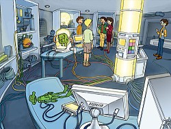 Mladí debrujári v laboratóriu profesora Scientifixa.