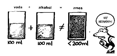 Nalejte presne 100 ml vody do odmerného valca. Pridajte rovnaké množstvo 90% alkoholu. Výsledný objem dvoch kvapalín je menší ako 200 ml !