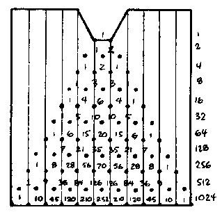 Číselný trojuholník, ktorý vidíte na obrázku, bol zostrojený matematikom Franciscom Galtonom. Tieto čísla zodpovedajú počtu guľôčok, ktoré prechádzajú medzi párom klincov. Teda ak hodíte 1024 guľôčok, jedna z nich prejde 1. a 11. priechodom, 10 guľôčok priechodom 2 a 10, 45 priechodom 3 a 9, atď.