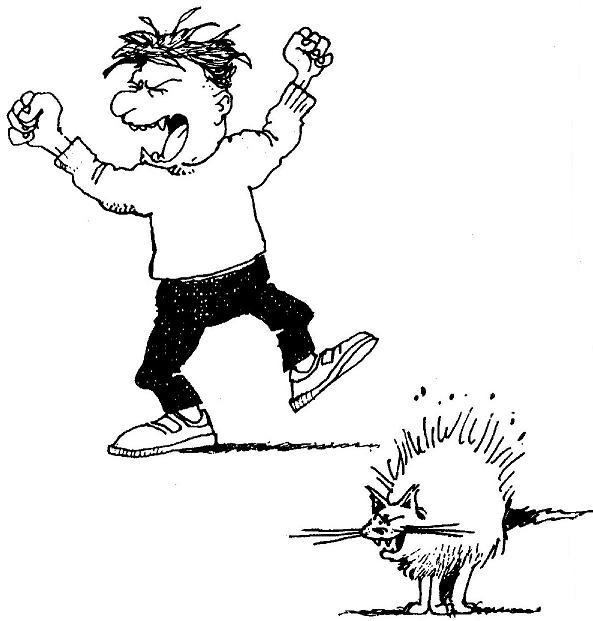 Oprite ju o seba tak, aby ste ju veľmi nestískali. Ale pozor, je to zviera nervózne, ktoré bude chcieť skočiť na zem v prípade podozrivého zvuku alebo v prítomnosti neznámeho psa. Neskúšajte ju znova zobrať, pretože v snahe utiecť, by vás mohla poškriabať. Ak musíte oddeliť psa a mačku, ktorí majú „rozdielne názory“, netreba hneď zobrať mačku na rameno. Neskôr vylejte vedro vody do šarvátky – to zmení ihneď postoje nepriateľov.
