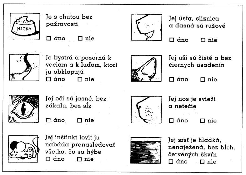 Môžeme si urobiť test zdravotného stavu ešte predtým, ako si dovezieme zviera domov. Overte si podľa nasledujúcej tabuľky, či má znaky zdravej mačky.